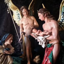 Dos ángeles bajan del cielo guiados por la estrella, para ver al verdadero Dios. Uno lo sostiene en sus brazos mientras el otro le regala un chupete al recien nacido dormido. Su madre, la Virgen María se postra de rodillas en un acto de adoración a Dios.